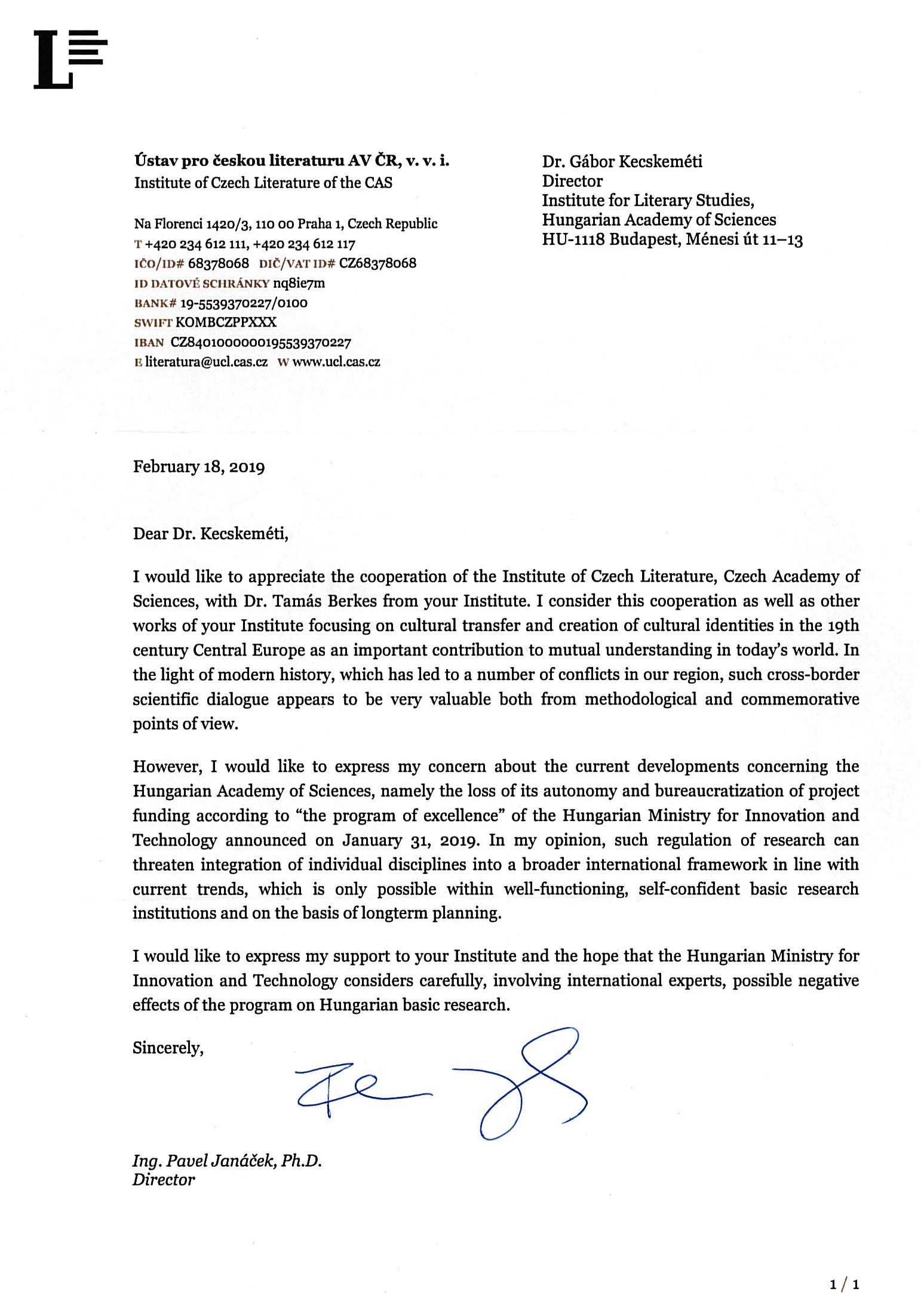 Pavel Janácek, a Cseh Tudományos Akadémia Cseh Irodalmi Intézetének igazgatója nagyra értékeli az intézeteink közötti együttműködést, külön kiemelve a közép-európai kulturális hagyományok közös ápolását és a szakmai kapcsolatot Berkes Tamás tudományos tanácsadóval, a Közép- és kelet-európai Osztály vezetőjével. Szolidaritásának hangot adva reményét fejezi ki a kialakult helyzet megoldására és a jól működő, alapkutatást lehetővé tevő, hosszú távú tervezést biztosító intézményi struktúra működtetésének lehetőségére.