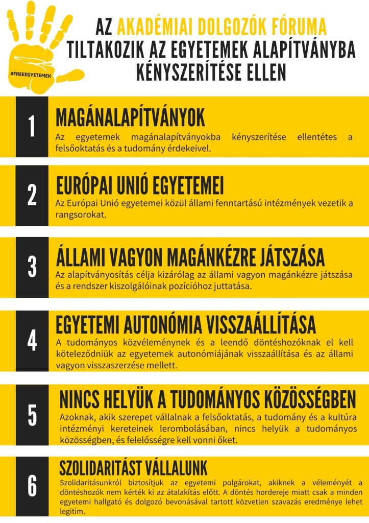 A tervezett átalakításokról az egyetemek hallgatóinak és dolgozóinak közvetlenül kellene dönteniük, minden részletre kiterjedő tájékoztatást követően. A tájékoztatást pedig olyan alapos és nyílt elemzésnek kell követnie, amely kizárja, hogy pusztán hatalomtechnikai eszközökkel keresztülvitt, beláthatatlan következményekkel járó és elhamarkodott változtatásnak essen áldozatul a hazai felsőoktatás. Az akadémiai kutatóhálózat kidolgozatlan átalakításának rossz tapasztalatai után az Akadémiai Dolgozók Fóruma átérzi az egyetemi hallgatók és dolgozók helyzetét, szolidaritásáról és támogatásáról biztosítja őket.