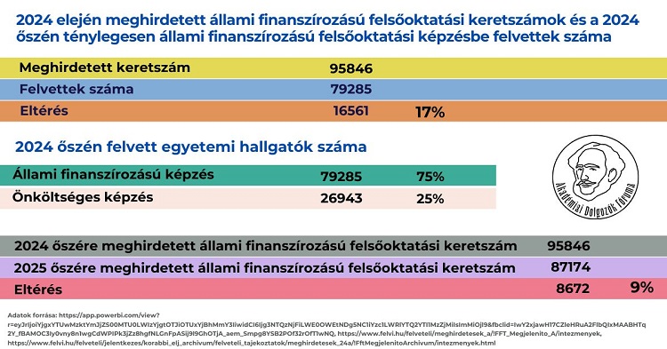 2024 őszére Magyarországon 95846 állami finanszírozású felsőfokú férőhelyet hirdetett meg a minisztérium, 2025 őszére pedig 87174-et. Ide tartozik az összes alapítványi, állami és egyéb, Magyarországon működő egyetem minden alap-, osztatlan és mesterszakos képzése. A meghirdetett állami finanszírozású férőhelyek számában tavalyhoz képest tehát körülbelül 9% a csökkenés.